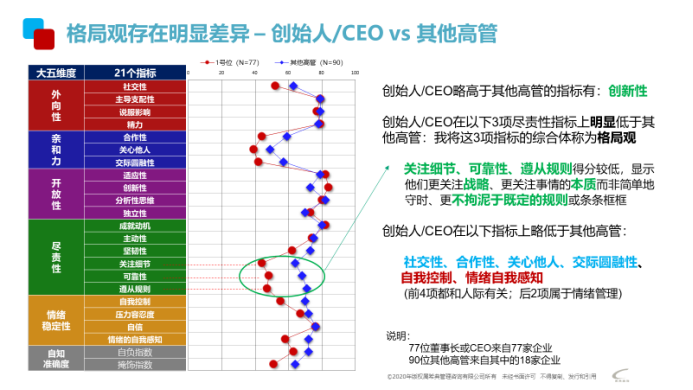 随后,他又将这些“企业一号位”与其他核心高管的“大五人格WBI测评”数据进行了对比,结果发现:“一号位”们在关注细节、可靠性(信守承诺,按时完成任务)、遵从规则等3个WBI指标上,得分明显低于其他高管们。