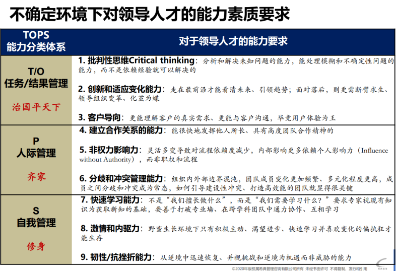 第三,治国平天下任务和结果管理的能力,也是基于复杂、多变和不确定的时代特征,而要求领导人才要比过去更加理性,更加关注长期价值客户导向,是理解客户的真实需求,为客户创造价值这很好理解,以客户为中心是企业未来持续发展的基石,毕竟用户体验为王。